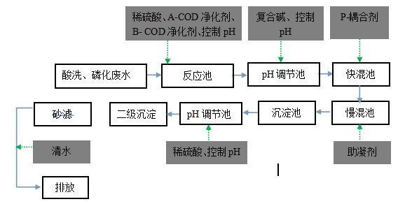 材料:原水,A-COD净化剂,B- COD净化剂,P-耦合剂,稀硫酸,复合碱,助凝剂;